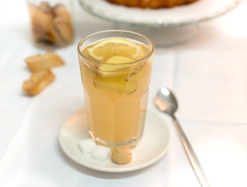 Warme gember infusie met schijfjes verse gember.